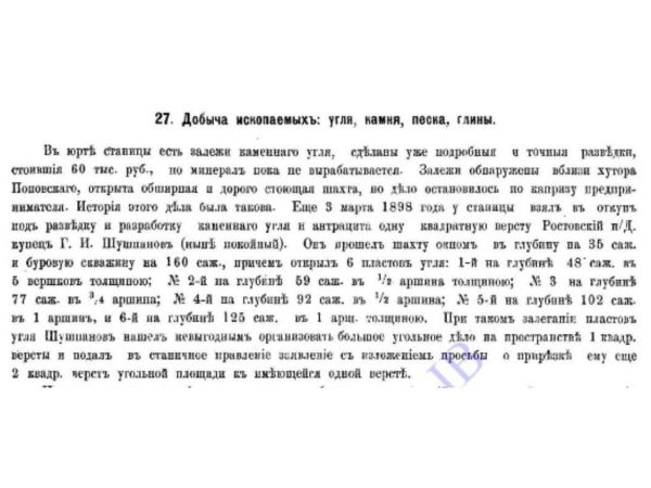 Почему в 1811 году при продаже имущества шахта не значилась? Если читатели располагают достоверной информацией о данной шахте (1805 года, глубиной 25 метров), просьба сообщить в редакцию по телефону 8-928-180-43-04 или непосредственно краеведам «Корни твои».
