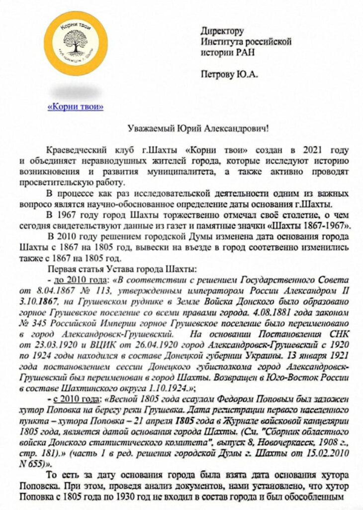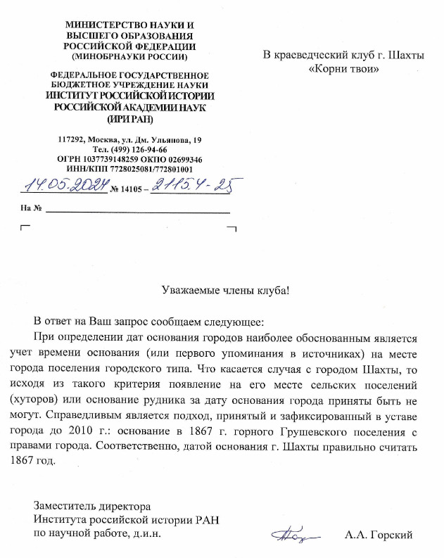 На запрос клуба был получен ответ института Российской истории Российской Академии наук (ИРИ РАН) за подписью заместителя директора по научной работе ИРИ РАН А.А.Горского, в котором указывалось: «…что касается случая с городом Шахты, то … появление на его месте сельских поселений (хуторов) или основание рудника за дату основания города приняты быть не могут. Справедливым является подход, принятый и зафиксированный в уставе города до 2010г.: основание в 1867г. Горного Грушевского поселения с правами города. Соответственно, датой основания г.Шахты правильно считать 1867 год».