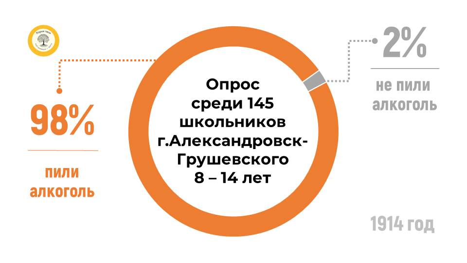 В 1914 году в одной из начальных школ окраины города провели анонимный опрос среди детей 8-14 лет по вопросу употребления ими спиртных напитков (таб. 1). Результаты оказались ужасающими: 9 из 10 детей пили вино, почти каждый третий пробовал и водку, и вино и пиво. На вопрос «Кто поил тебя в первый раз?» почти все отвечали «родители» или «бабушка и дедушка» [4].