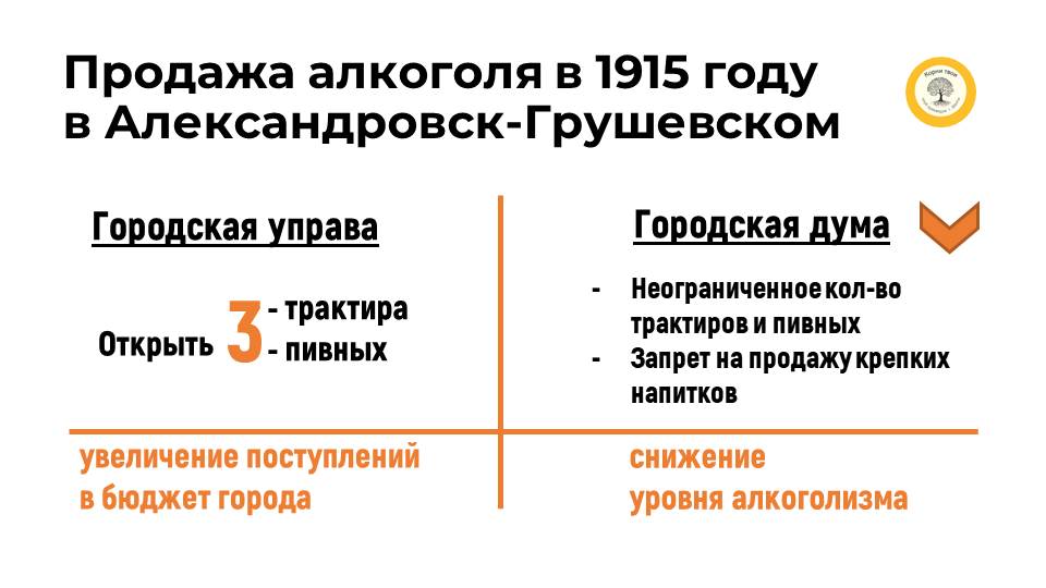 Большая часть Думы (15 гласных из 28) предлагала двигаться в противоположную сторону – разрешить неограниченное количество трактиров, но запретить в городе полную продажу крепких напитков. Это решение и было утверждено [9]. При этом, по данным городской управы, в 1914 году употребили только водки на 800 тысяч рублей [10]. Местные горнопромышленники молнеиносно отмечали, что с запретом торговли спиртных напитков увеличилась производительность труда, а всё – из-за сокращения прогулов шахтеров [11].